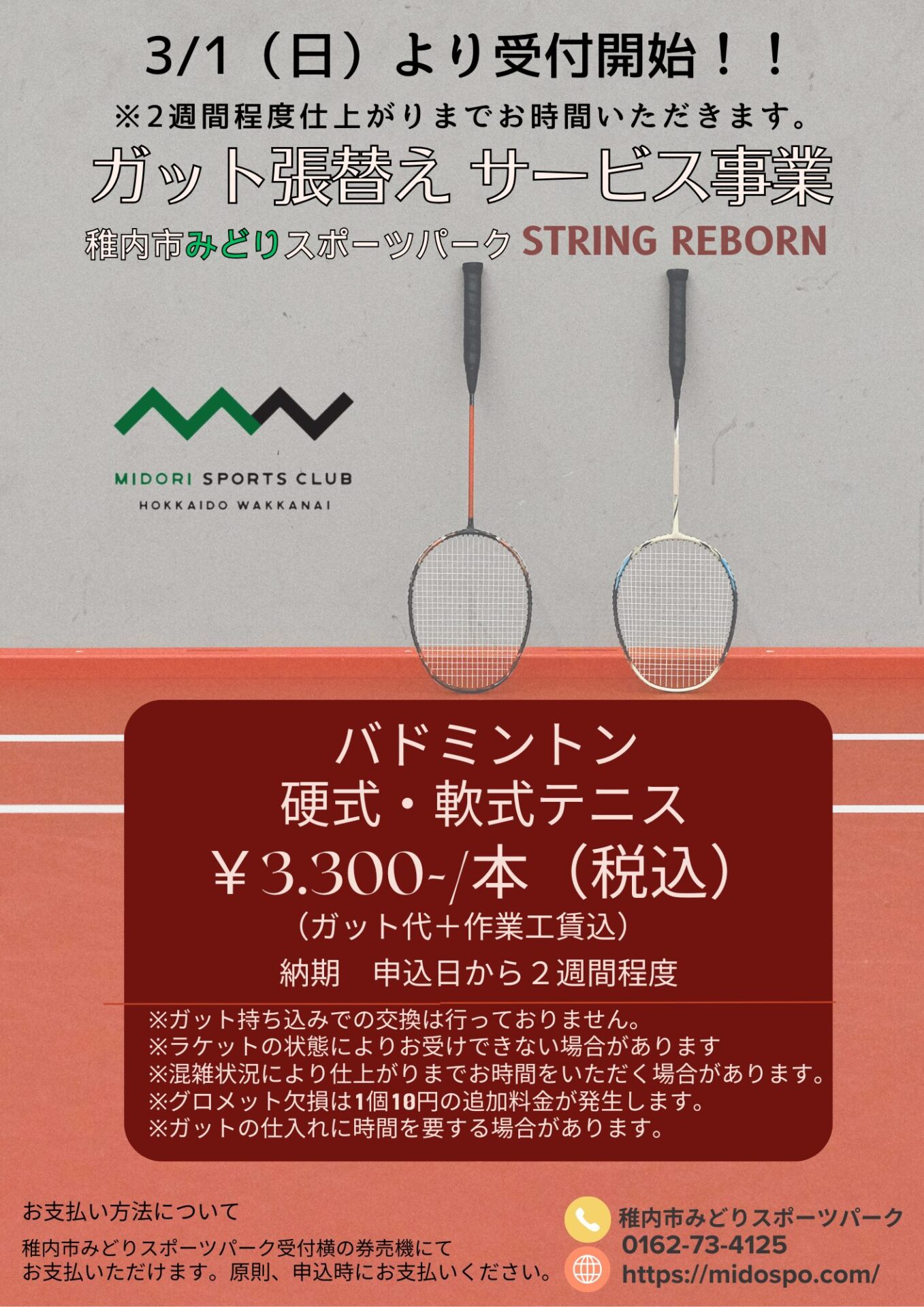このたび、バドミントンラケットおよび硬式・軟式テニスラケットのガット張り替えサービスをスタートします。部活やサークルでがんばる皆さんのラケットを、みどスポでお預かりして張り替えいたします。
